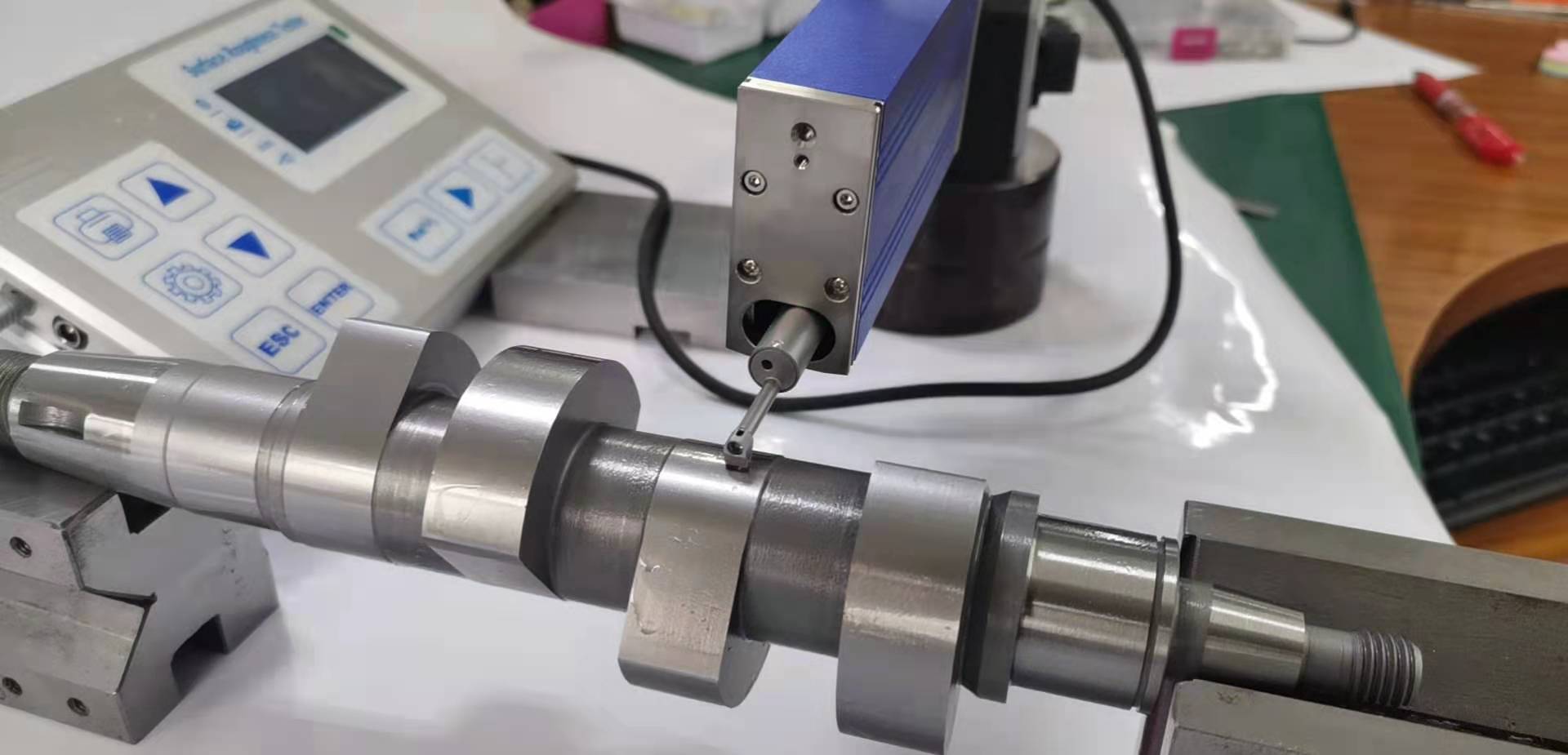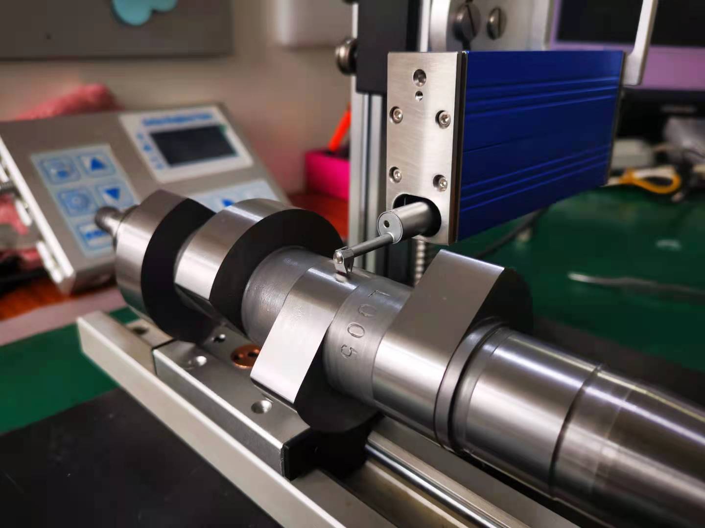 由于曲軸的被測(cè)面的位置窄,傳統(tǒng)粗糙度儀的傳感器的移動(dòng)方向是前后移動(dòng)的,而粗糙度測(cè)量時(shí)要求垂直于加工方向的,所以測(cè)量曲軸時(shí)需要轉(zhuǎn)接桿或直角轉(zhuǎn)接機(jī)構(gòu)才能完成測(cè)量。這樣傳感器與主機(jī)連接點(diǎn)增加了2個(gè),所以造成測(cè)出來的值不穩(wěn)定。