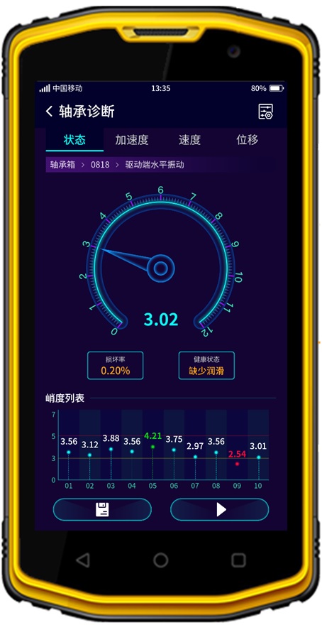 1. 軸承狀態(tài)結論清晰直觀:直接按綠、黃、紅來指示,同時配以文字說明,如:潤滑不良等直接文字提示。