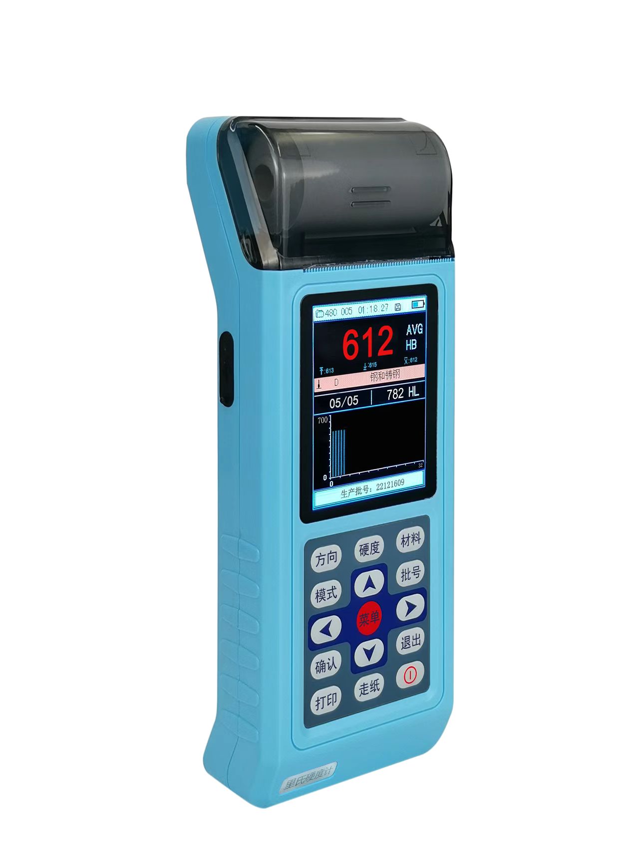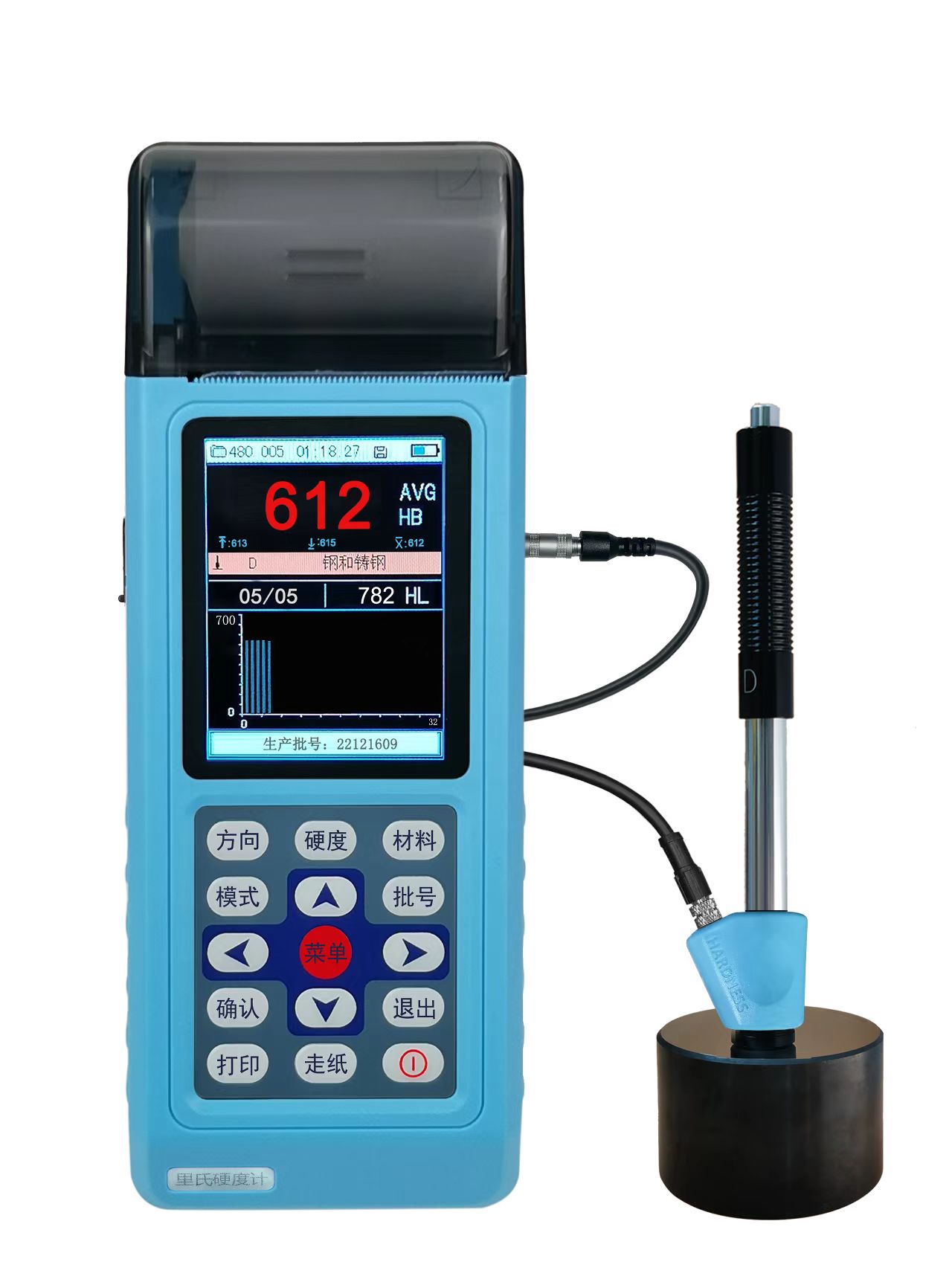 l 可存儲510個文件,每個文件46~215組(沖擊次數(shù)32~1)單次測量值、平均值、測量日期、沖擊方向、次數(shù)、材料、硬度制、等信息。