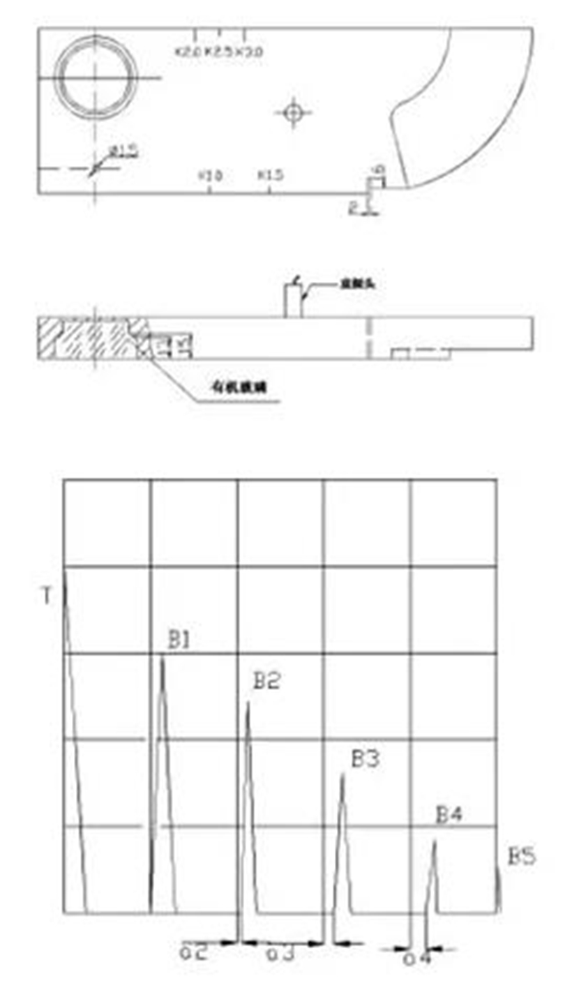 根據(jù)AVG原理,在探頭探傷時可把R100mm圓弧面視為大平底反射,以此來調(diào)整探測靈敏度。直探頭探傷時可把厚度為25/100mm的幾個側(cè)面視為大平底處理,以此來調(diào)整靈敏度。另外,也可以根據(jù)探傷要求,儀測量1.5mm橫通孔反射波來確定靈敏度。