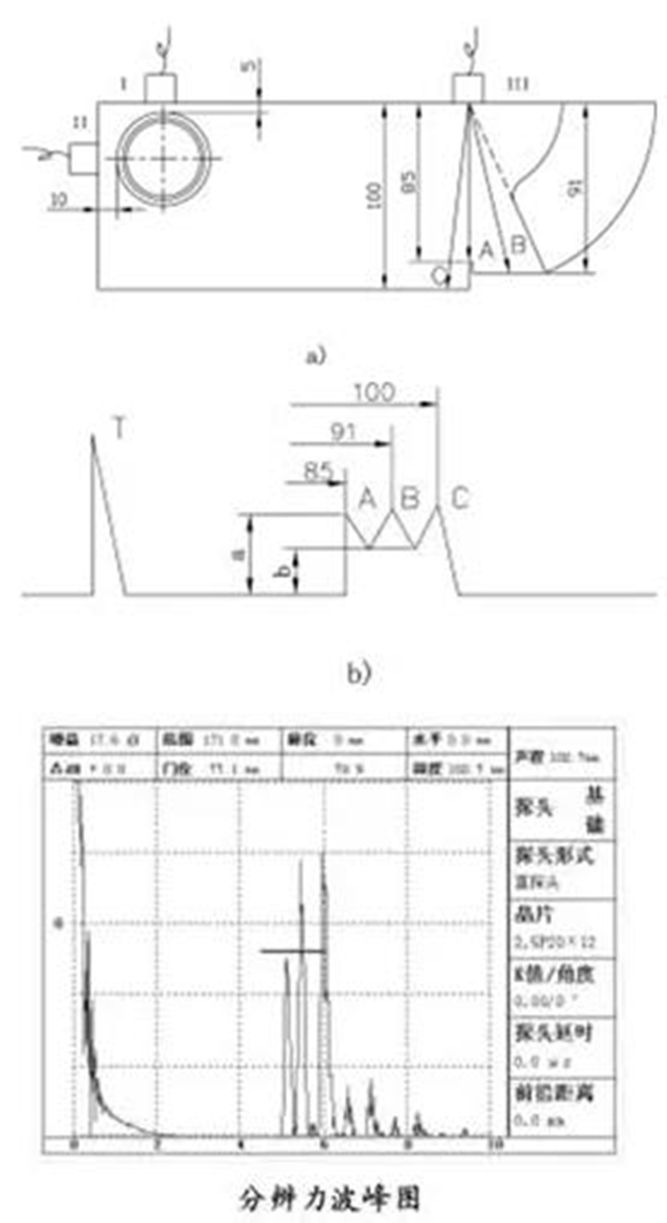 根據(jù)AVG原理,在探頭探傷時可把R100mm圓弧面視為大平底反射,以此來調(diào)整探測靈敏度。直探頭探傷時可把厚度為25/100mm的幾個側(cè)面視為大平底處理,以此來調(diào)整靈敏度。另外,也可以根據(jù)探傷要求,儀測量1.5mm橫通孔反射波來確定靈敏度。